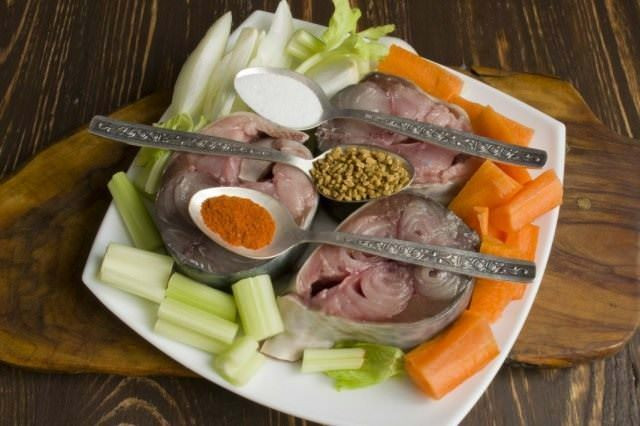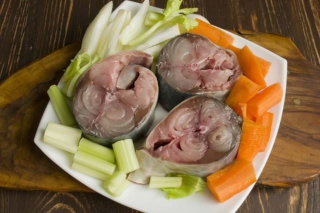 К рыбе добавляем нарезанную небольшими брусками морковку и также порезанные стебли сельдерея. Рыбка приготовится быстро, поэтому овощи нельзя нарезать крупно, они останутся сырыми.
