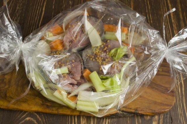 Берём рукав для запекания, раскрываем, укладываем внутрь куски тунца с овощами, добавляем нарезанный крупно репчатый лук. Отрываем тонкую полоску с края рукава, завязываем плотно сначала один край, затем отрезаем нужную длину рукава и завязываем второй край.