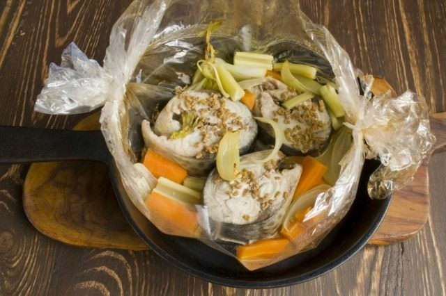 Разрезаем рукав, тунец готов – нежная, ароматная рыбка и овощной гарнир в придачу.