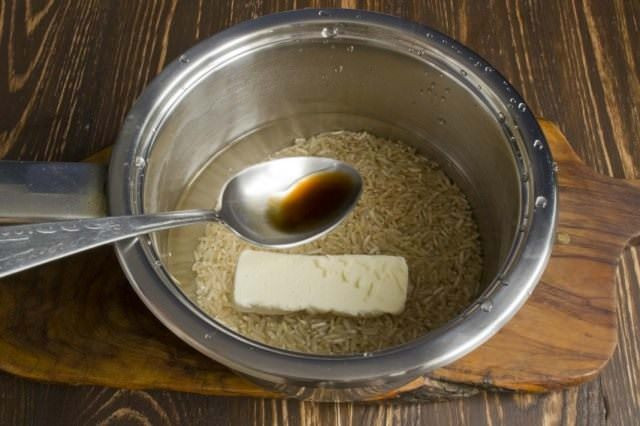 Теперь варим бурый рис. В небольшой толстостенный сотейник насыпаем 2 г поваренной соли, кладём сливочное масло, затем – тщательно промытый бурый рис. Наливаем 250 мл холодной воды и соевый соус, отправляем сотейник на огонь. После закипания убавляем газ до минимума, закрываем сотейник плотно. Варим 20 минут, готовый рис укутываем полотенцем, оставляем распариваться на полчаса.