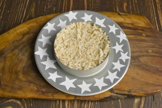 На праздничную тарелку ставим кулинарное кольцо, плотно укладываем порцию бурого риса.