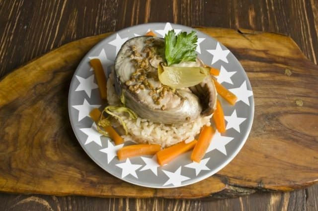 На рис кладём приготовленного в рукаве тунца, добавляем немного запеченной моркови, сельдерея и дольки запеченного лука. Украшаем блюдо зеленью, поливаем соевым соусом и подаём к столу. Запеченная рыба в рукаве с бурым рисом готова. Приятного аппетита!