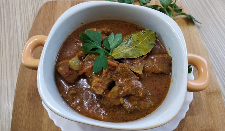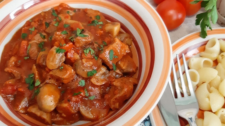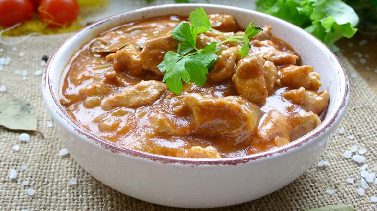 - Потушите гуляш в томатном соусе под прикрытой крышкой в течение 30 минут на небольшом огне.