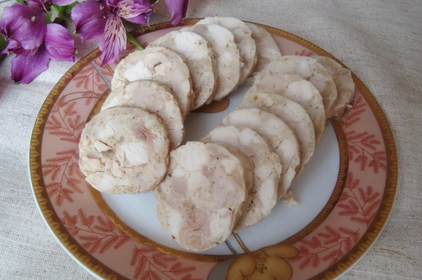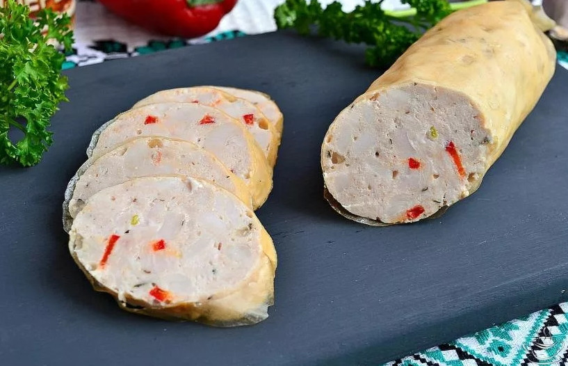 - Готовую домашнюю куриную колбасу охладить, порезать на порционные куски и кушать. Приятного аппетита!