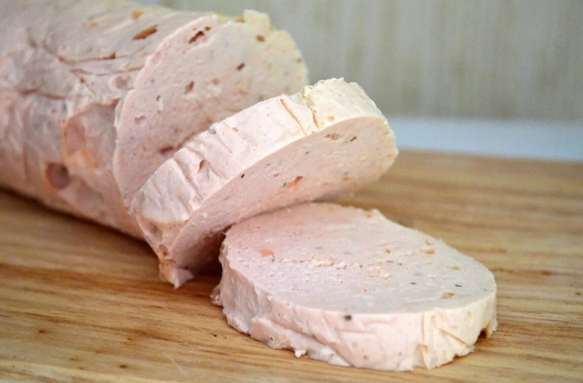 - Через 12 часов аккуратно провести лопаткой, кухонным шпателем или ножом между стенок ёмкости и куриной колбасой и вынуть её из формы. Нарезать «докторскую» колбасу кружочками и подать домашнюю куриную колбасу к столу. Приятного аппетита!
