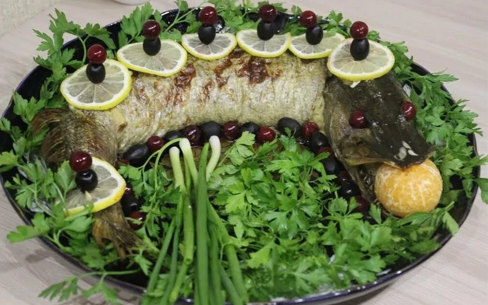 - Нафаршировать рыбу приготовленным фаршем. Противень застелить пекарской бумагой, поместить на него рыбу, смазать обильно растительным маслом. Проткнуть кожу в нескольких местах зубочисткой во избежание разрыва кожи при запекании. Запекать в течение 40 – 60 мин. Рыбка готова. Выложить рыбу на блюдо. Украсить по вкусу. Приятного аппетита!