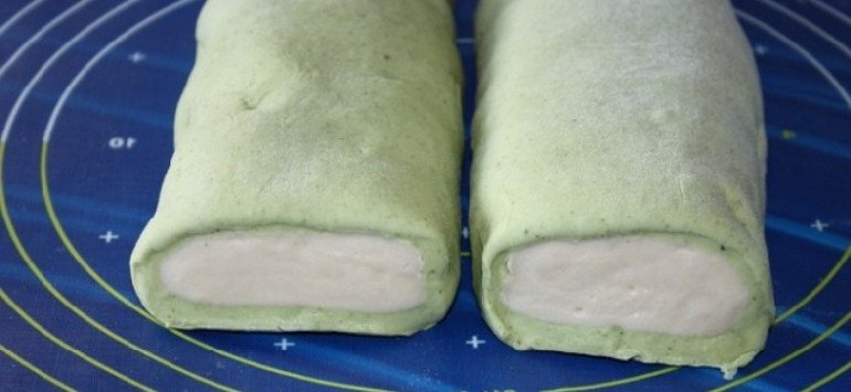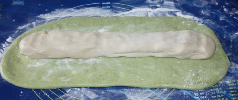 - Оба теста можно использовать отдельно или можно зелёное немного раскатать, положить в центр белое тесто, завернуть и поставить в холод на час.