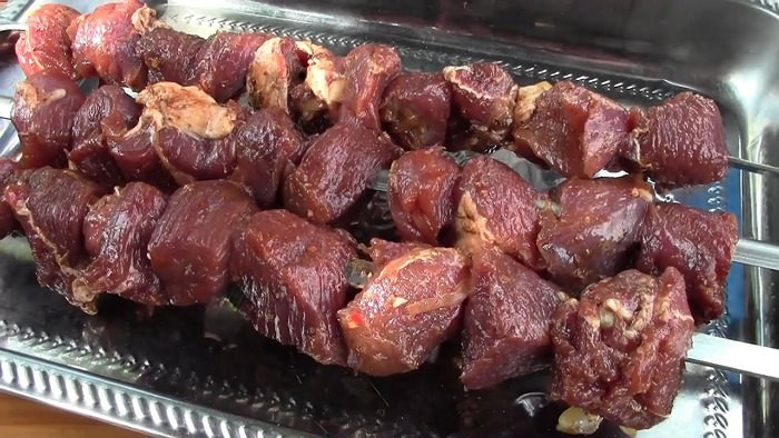 - Спустя несколько часов маринования, в зависимости от жёсткости, собираем шампуры, которые отправляются на огонь.