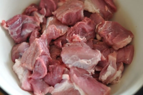 - Промойте свинину под краном холодной водой, обсушите, удалите тонкую пленку и кости, если остались. Нарежьте кусками толщиной 4-5 см, переложите в глубокую эмалированную емкость.