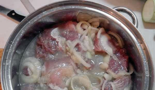 - Очистите лук, нарежьте его кольцами. Если хотите его потом использовать в другом блюде, режьте кубиками. Переложите в кастрюлю с мясом.