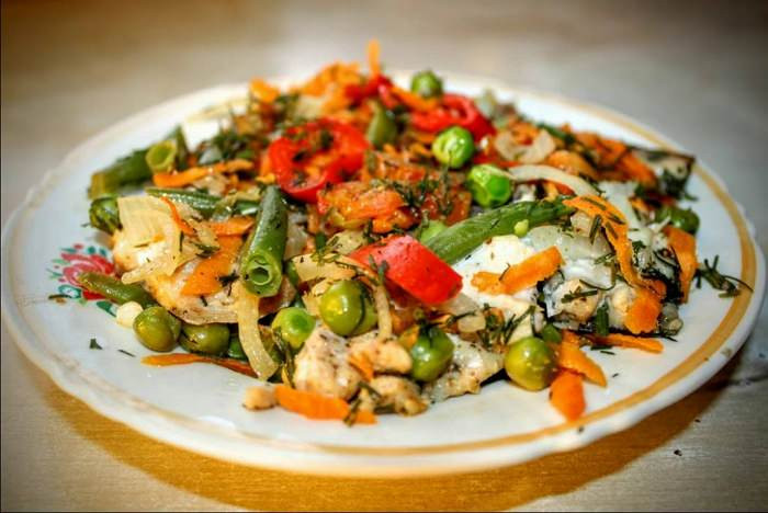 Зелень обмойте, измельчите, добавьте к овощам. Рыбу очистите, удалите голову, хвост, срежьте плавники, разделайте на филе, нарежьте порционными кусочками.