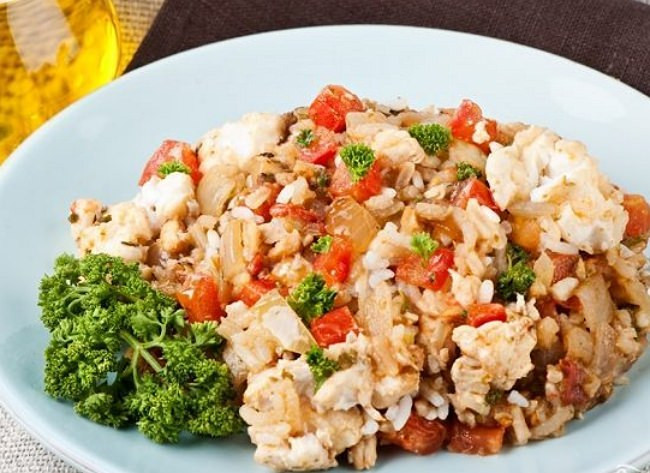 Рыбу выпотрошить, отрезать голову и хвост, срезать с хребта филе и удалить из него все косточки и снять кожу. Порезать филе на мелкие кусочки. Тушёную овощную массу выложить к рису и влить вино. Смесь тщательно перемешать.