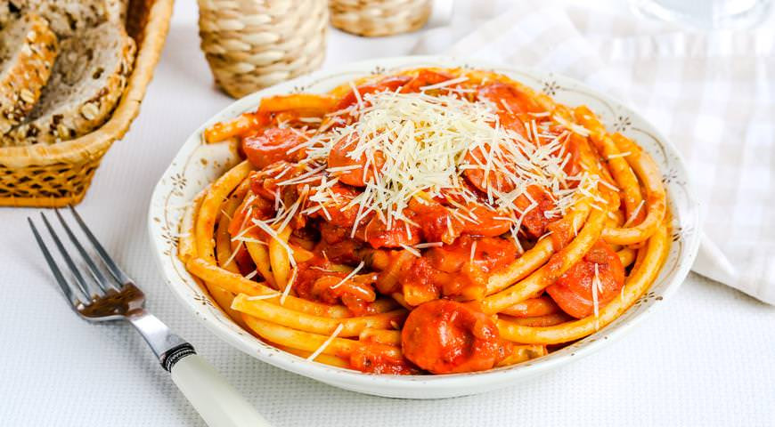 Добавьте в горячий, кипящий соус отваренные макароны. Перемешайте. Оставьте все закипать на среднем огне, а после тушите еще 2-3 минуты, чтобы жидкость выпарилась.