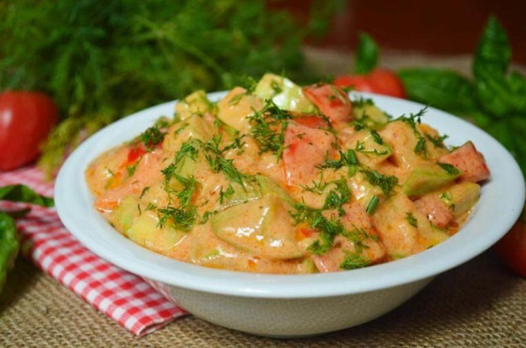 - Подаём кабачки в сметанном соусе как горячую или как холодную закуску со свежим домашним белым хлебом.