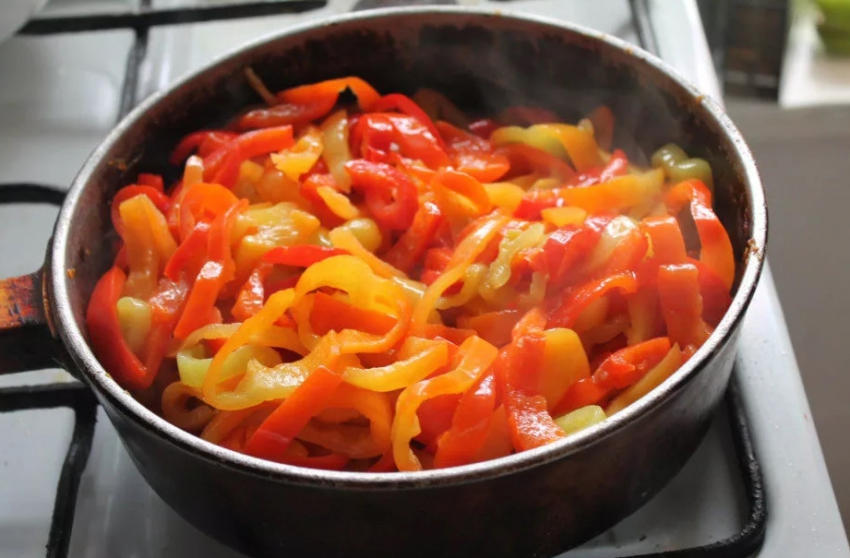 - На растительном масле обжарить лук. Добавить морковь. Обжарить. Добавить перец. Тушить под крышкой в течение 5–7 минут.