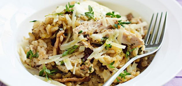 - Минуток через 15-17, как только крупа будет почти приготовлена, можешь положить в сковороду горошек и грибы. Налей еще бульона, присоли, поперчи, готовь еще минутки три и подавай.