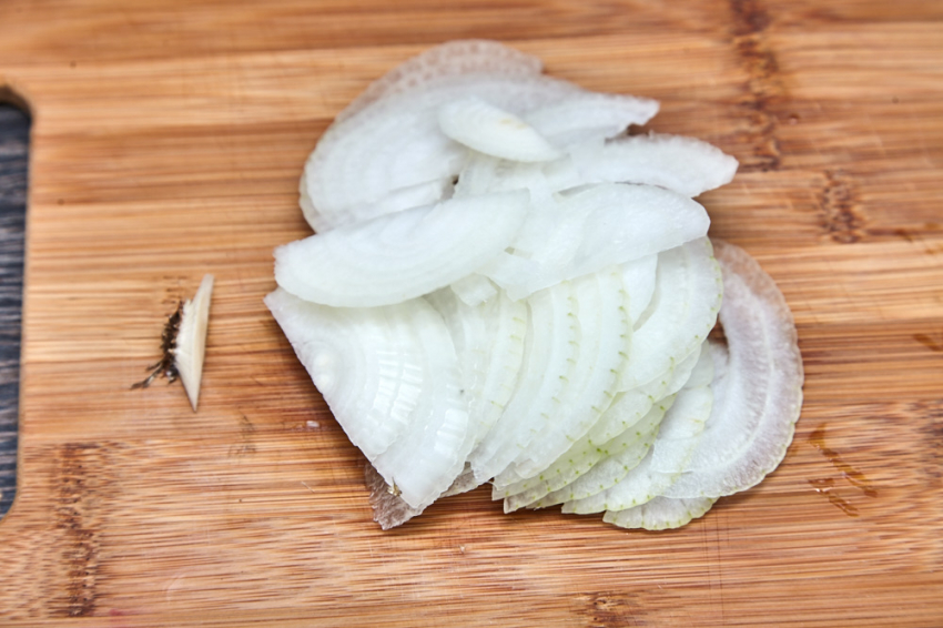3. Чистим лук, нарезаем его тонкими полукольцами.