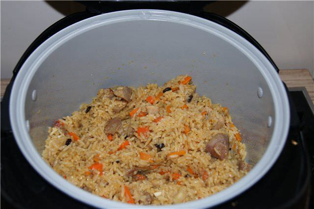 Тушить на маленьком огне пять минут, помешивая. Добавить специи, рис, влить чуть больше половины литра воды. Будущее блюдо приправить, закрыть на полчаса. Чеснок очистить и расположить по плову. Так же поступить и с барбарисом. Готовить еще десять минут, затем дать блюду настояться перед подачей.