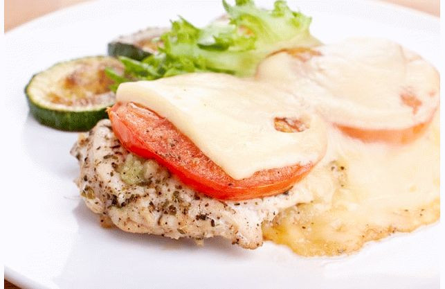 Сразу переходим к следующему шагу. На уже обжаренную сторону выложить лук. Густо посыпать сыром каждый кусочек. Накрыть крышкой. Жарить на среднем огне 5 минут. За это время сырая сторона курицы успеет хорошенько прожариться, а сыр отлично расплавится! Снимаем крышку. Подавать горячим. На гарнир можно приготовить пюре, рис, или просто подать с салатом. Приятного аппетита!