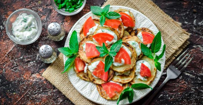 Кабачки жареные можно приготовить и с помидорами. Для этого нужно нарезать помидоры кубиками, добавить мелко нарубленную зелень и чеснок, смешать с майонезом и выложить на обжаренные кружочки кабачка.