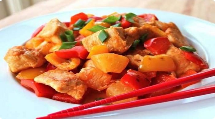 Курица в кисло сладком соусе с овощами