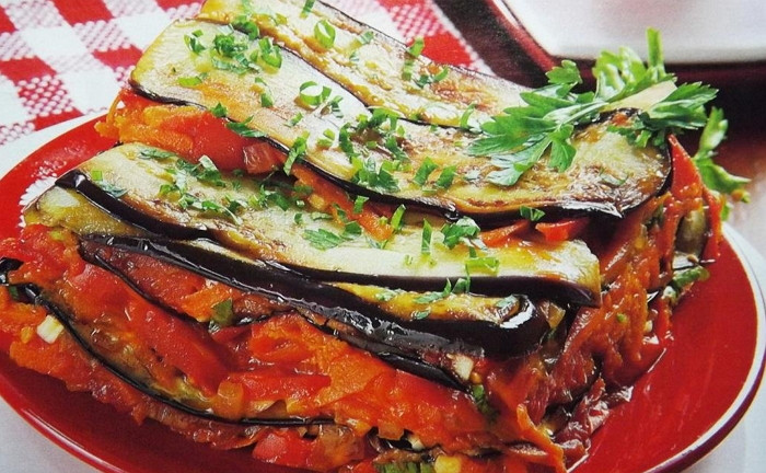- Берем контейнер и выкладываем в него слой из баклажанов, поливаем его соусом, затем снова выкладываем баклажаны. И еще раз наливаем соус. И так до тех пор, пока не закончатся все баклажаны. Затем накрываем их крышкой и в таком виде оставляем на 30 минут. По желанию присыпаем измельченной зеленью.