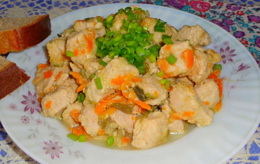 - Выложить к овощам кусочки индейки, добавить 1,5 стакана воды и тушить на умеренном огне около 40-45 минут. Добавить специи и досолить (если необходимо).