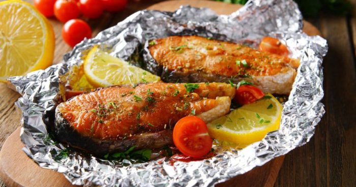 - Перенесите кусочки горбуши, аккуратно завернутые в алюминиевую фольгу, на решетку примерно на 8 минут. Приготовленная рыба должна тушиться минут пять. Только после этого можно подавать его, сбрызнув небольшим количеством лимонного сока.
