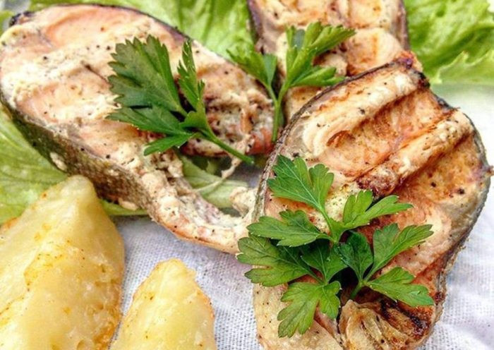 - Готовим рыбу как следует, как шашлык, немного сбрызнув маринадом.