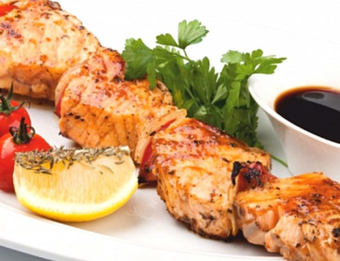 - После этого нужно жарить кусочки не более 10 минут, время от времени переворачивая. По истечении этого времени остается только снять блюдо с гриля, залить соусом и подать рыбу на шпажках.