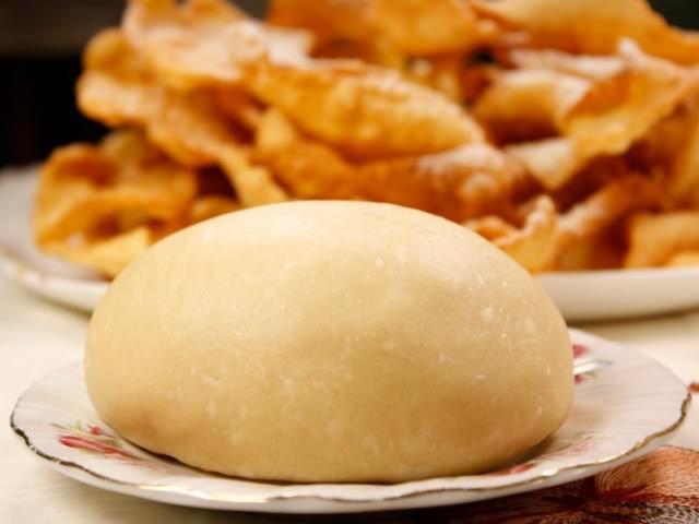- Вода 2/3 стакана, масло растительное 1/3 стакана и щепотку соли чуть подогреть и добавить муки до состояния лапшового или пельменного теста. Дать расстояться тесту 2 часа при комнатной температуре.