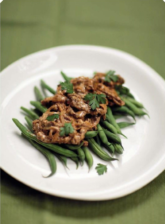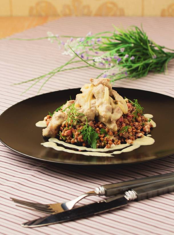 Бефстроганов сочетает в себе компоненты двух кулинарных традиций: французской (обжаренные в панировке кусочки говядины) и русской (сметанно-томатный соус, который не подается отдельно). Залог успеха при приготовлении этого блюда заключен в быстрой обжарке (запечатывании) мяса до золотистой корочки и дальнейшем тушении его в соусе. Говядина получается нежной, ароматной, тающей во рту. К бефстроганову прекрасно подойдут шанежки — несладкие пирожки с начинкой.