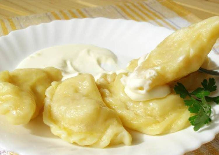 Для того чтобы вареники с картофелем получились необыкновенно вкусными, предлагаем картофель для начинки не отваривать, а запечь на соли. Соль заберет из картофеля лишнюю влагу, и в итоге при протирании через сито пюре получится не зернистым или жидким, а плотным и бархатистым. Именно такое пюре необходимо для идеальной начинки. Подать вареники можно с одним из соусов — из соленых огурцов или грибным.