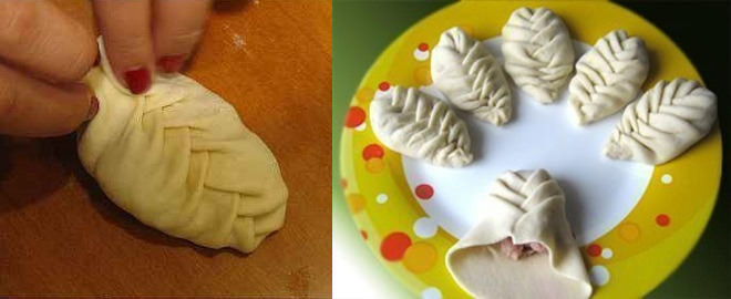 Кладем на серединку кругляшка начинку, складываем края пополам и защипываем нижний уголок к верху. Далее снова получается уголок и его снова защипываем кверху и так продолжаем до самого верха.