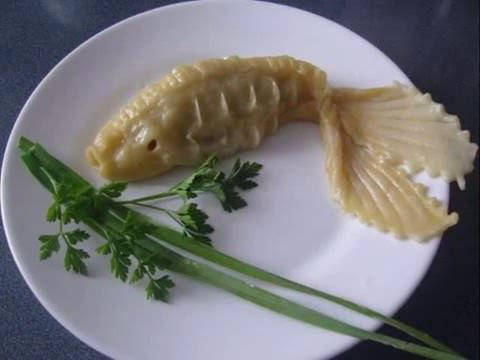 Для того чтобы сделать вареники в форме рыбок нужно замесить эластичное, плотное тесто, которое не порвется во время лепки. Тесто тонко раскатать, чашкой вырезать довольно крупные кружки (чем больше кружок теста, тем шикарнее получится хвостик у рыбки), затем выкладываем начинку ближе к одному краю – там будет голова нашей рыбки. Затем тесто свернуть с боков и защипнуть сверху, так мы получим туловище рыбки с плавником на спине. Часть вареника, где намечался хвостик, разрезается по бокам, создавая хвостовые плавники, для большей натуральности на них стоит зубочисткой продавить рельефные борозды.