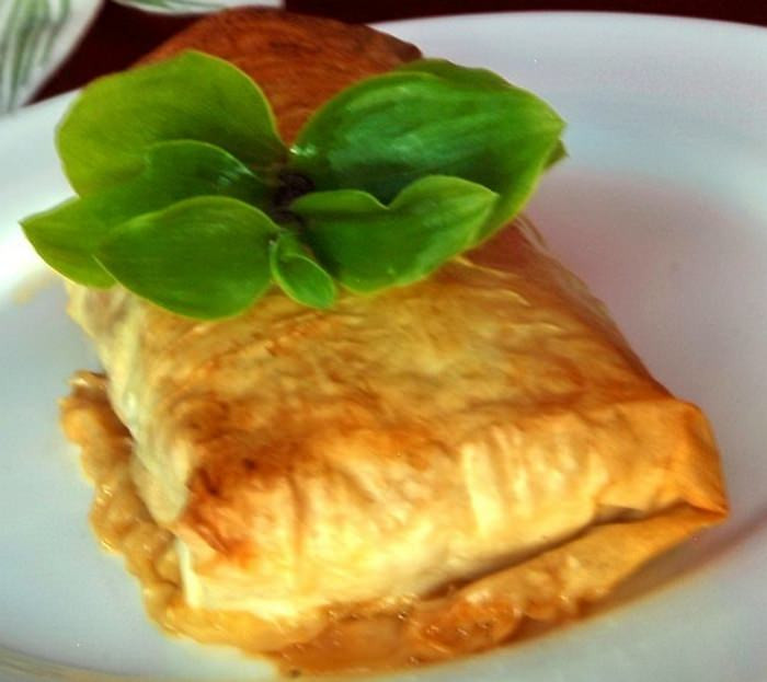 Заворачиваем начинку в тесто, укладываем на противень для запекания так, чтобы сыр был сверху, сверху смазываем сливочным маслом. И ставим в разогретую духовку на 20-25 минут.