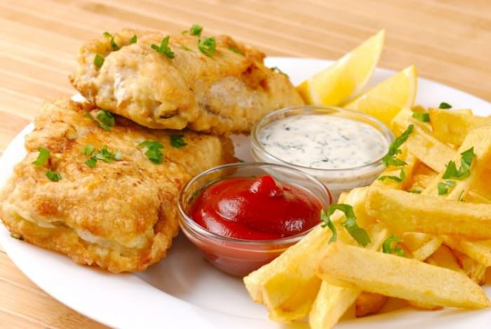 Обжариваем 7 минут с одной стороны, а затем переворачиваем, накрываем крышкой и 5 минут с другой. Рыбу подаем с картофелем фри и соусом. Приятного аппетита!