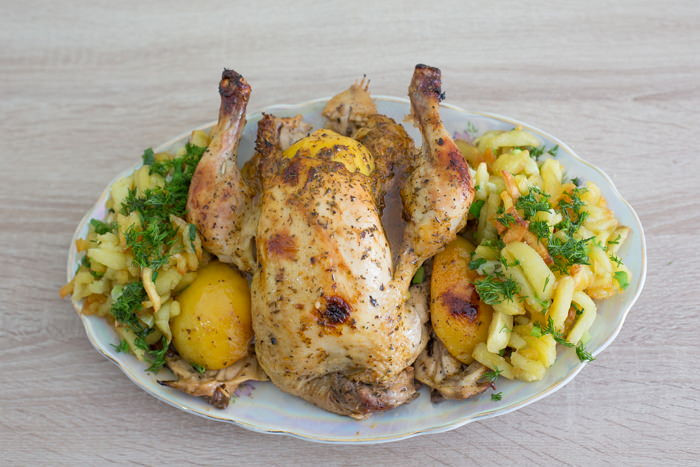 За счет ломтиков лимона, засунутых под кожу на грудке и бедрах, мясо приобретает тонкий лимонный привкус. Кстати, курица по этому рецепту – отличный вариант для праздничного ужина.Ингредиенты: