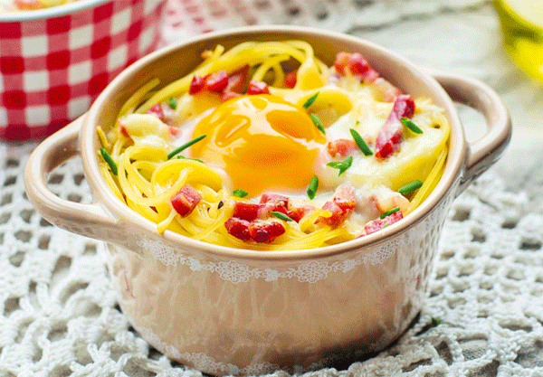 Спагетти отварите с солью до готовности согласно инструкции на упаковке. Заправьте оливковым маслом и переложите в огнеупорные формы. Ветчину нарежьте соломкой и поместите на макароны. Сверху разбейте по яйцу. Посолите. Поместите формы в заранее разогретую до 200 °C духовку и готовьте около 10–12 минут, пока «не схватятся» белки. Посыпьте измельченной зеленью.