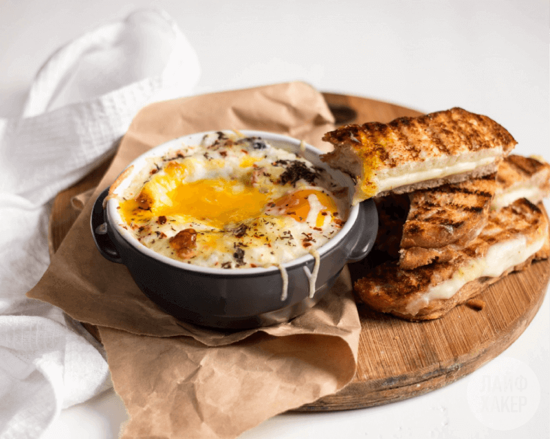 - Подаем готовые яйца по-неаполитански сразу же после приготовления с гренками или свежайшим хлебушком.