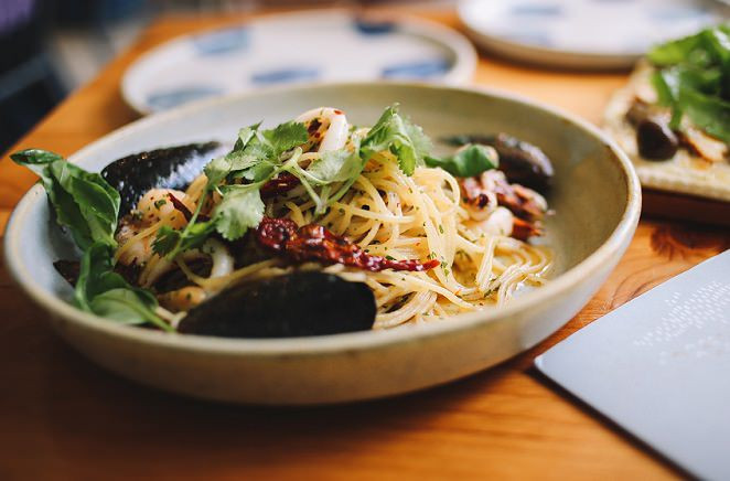 Паста с морепродуктами и грибами