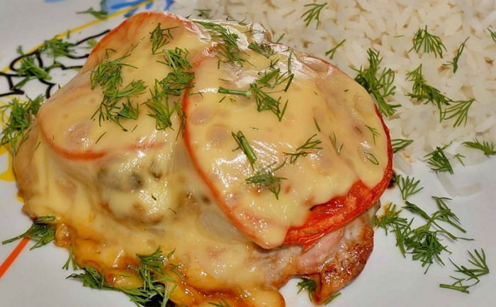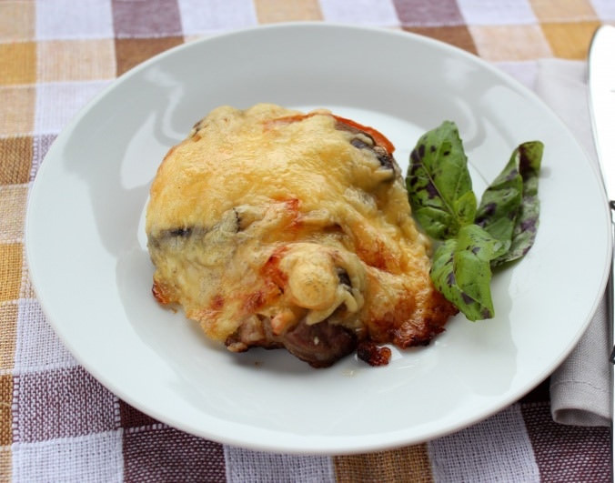 - Противень смазать растительным маслом, разложить на нем подготовленное отбитое мясо. Сверху присыпать тертым сыром, уложить грибы, затем по 2 ломтика помидора и сверху также сыр.