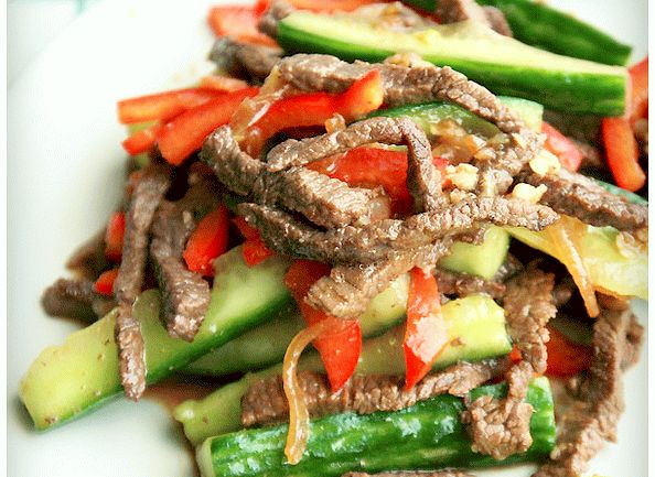 Огурчики разрезаем вдоль и нарезаем тоненько поперек. Чем тоньше, тем лучше. Можно натереть на специальной терке. Складываем в чашу и круто присаливаем. Перемешиваем и на время отставляем. Приготовление жареных огурцов с мясом по-корейски: шаг 22Немного подмороженное мясо режем соломкой. Лук режем полукольцами. Мясо обжариваем пару-тройку минут на растительном масле. Немного присаливаем, добавляем лук и обжариваем мясо с луком до готовности Мясо с луком перекладываем в тарелку.