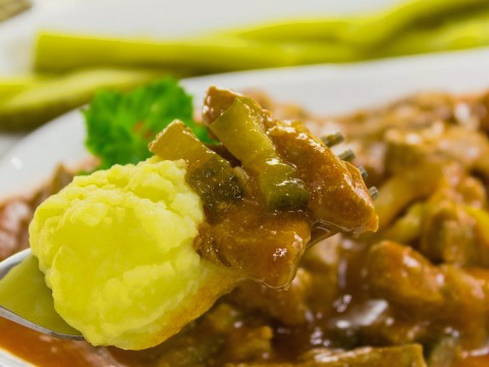 Говядина обжаривается на сковороде с репчатым луком и солеными огурцами. Далее туда наливается немного воды и всё тушится до готовности мяса. Отдельно обжаривается картофель, который затем добавляется к говядине, всё перемешивается и тушится до его готовности.Время готовки: 1 ч. 40 мин.