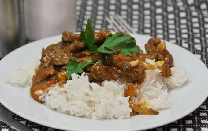 - Раскладываем по тарелкам рис с маслом, сверху выкладываем азу из говядины, украшаем всё петрушкой и подаём к столу. Приятного аппетита!