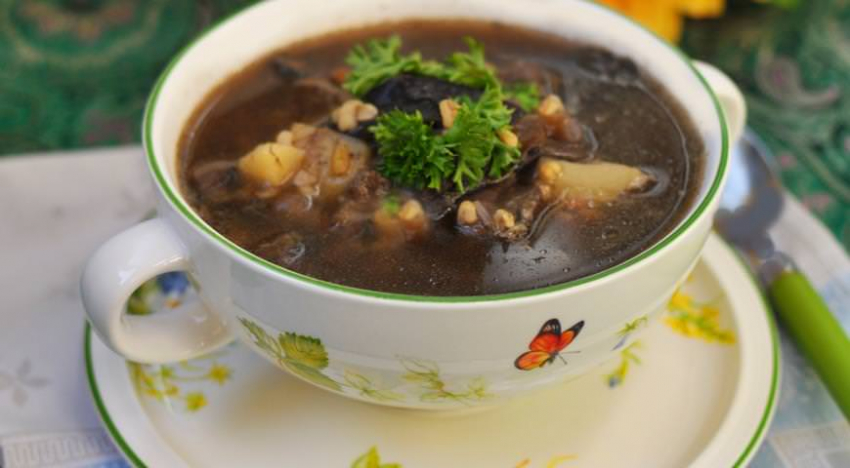 - Выложите в бульон овощи и грибы, приправьте солью и перцем, варите 10–15 минут.