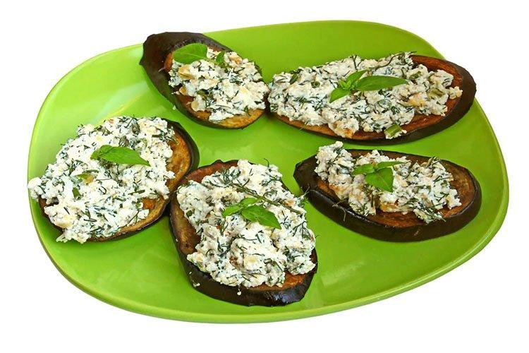 Продольно нарезанные баклажаны отварить в кипящей воде с солью 20 минут. Остудить, заправить начинкой из творога, зелени, чеснока, яиц и тертого сыра. Посыпать специями и запечь в духовке.