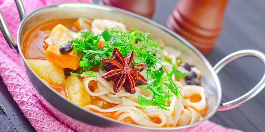 Перемешать и влить воду от лапши, чтобы она покрывала ингредиенты. Сменить режим на «Тушение» и готовить лагман в мультиварке 40 минут. За 15 минут до готовности положить звездочку бадьяна.