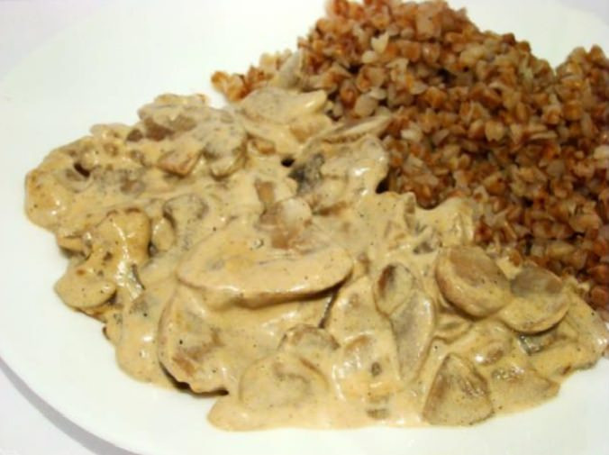 Готовую гречневую кашу со сметаной и яйцом переложить на тарелку, добавить жареные с луком грибы и перемешать. Гречка с грибами по-польски готова. Приятного аппетита!