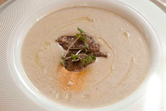 Гречневую крупу отварите в подсоленной воде до готовности. На масле обжарьте нарезанные лук, чеснок, картофель, добавьте бульон и проварите до готовности, после добавьте отварную гречку и сливки, доведите до готовности, посолите, поперчите. Пробейте в блендере и протрите через сито. Протертый суп прогрейте. Печень зачистите от пленок и замочите в молоке. Обжарьте печень на сковороде, посолите, поперчите и погасите коньяком. Суп разлейте по тарелкам, сверху выложите обжаренную печень, украсьте блюдо свежей зеленью.